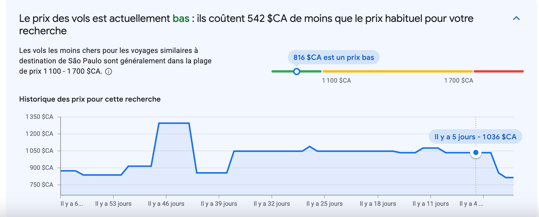 Vols directs aller-retour vers São Paulo dès 816$ au départ de Montréal, avec plusieurs dates disponibles entre mars et mai.
