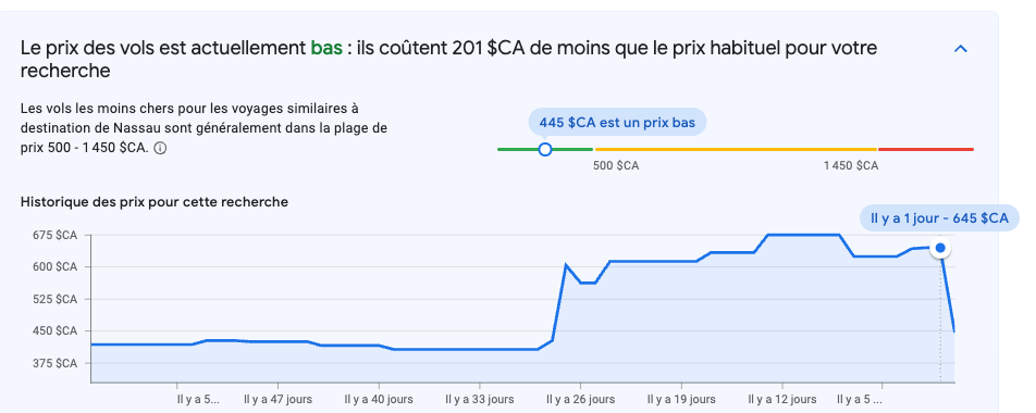 Après avoir bien augmenté, les prix vers les Bahamas (Nassau) viennent de chuter aujourd'hui, pour certaines dates de mai / juin (vol direct) au départ de Montréal😉