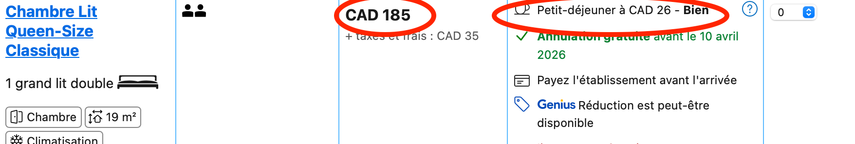 185 $ la nuit + 2 x 26$ pour petit déjeuner = 237$ sans inclure le coût du stationnement