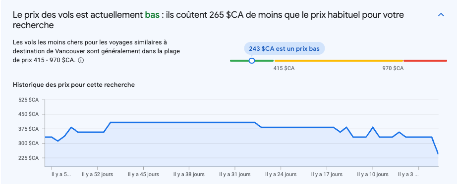 Vol A/R direct Montréal–Vancouver dès 252$, avec dates disponibles en mai.